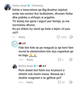 Dafina, e cila shpesh ka shprehur qëndrime të forta kundër dhunës dhe bullizimit, këtë herë u shpreh tejet e indinjuar. Në një koment të lënë në rrjetet sociale, ajo shkroi: “Është e tmerrshme që Big Brother lejohet ende me ekzistu! Kur bullizimin, dhunën fizike dhe psikike e shfaqin si argëtim. TV duhej me qenë i sigurt për fëmije, jo me normalizu dhunë. Ku po shkon ky vend që këtë lejon vit pas viti?”