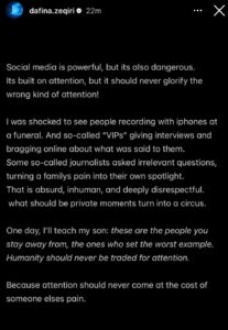 Më pas, Dafina shpërtheu edhe ndaj “VIP”-ave, ku tha: “U trondita kur pashë njerëz që filmonin me telefona në një varrim. Ndërkohë disa të ashtuquajtur “VIP” jepnin intervista e mburreshin online me fjalët që u ishin thënë. Madje edhe disa gazetarë bënin pyetje të parëndësishme, duke e kthyer dhimbjen e një familjeje në dritën e reflektorit për interesin e tyre. Kjo është absurde, çnjerëzore dhe thellësisht mosrespektuese. Çfarë duhet të ishin momente private, u shndërruan në një shfaqje”.